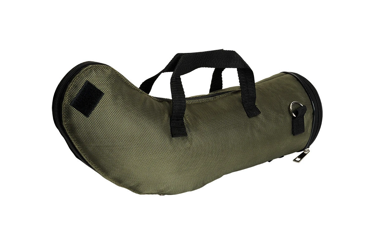 The case is water resistant in the event of an unexpected downpour and padded to protect the optics from bumps. Zippered openings allow the spotting scope to be attached to a tripod and viewed through while in the case. Velcro tabs on the sides and front allow the case to be folded under the scope and out of the way for a clear view and easy access to the eyepiece and focus knobs. The case also includes convenient nylon handles and a removable shoulder strap for easy transportation.