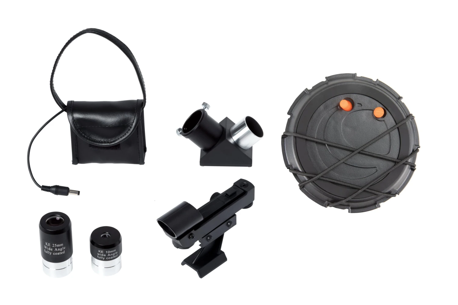 The Astro Fi 90 comes with two eyepieces (25mm and 10mm), a star diagonal, an integrated smartphone adapter, and a red dot finderscope.Ā The two eyepieces offer different magnifications to view your intended object. The star diagonal provides a right-side-up viewing for a more comfortable viewing angle when looking up at the sky. The red dot finderscope will help you quickly center an object in your eyepiece for easier observing.