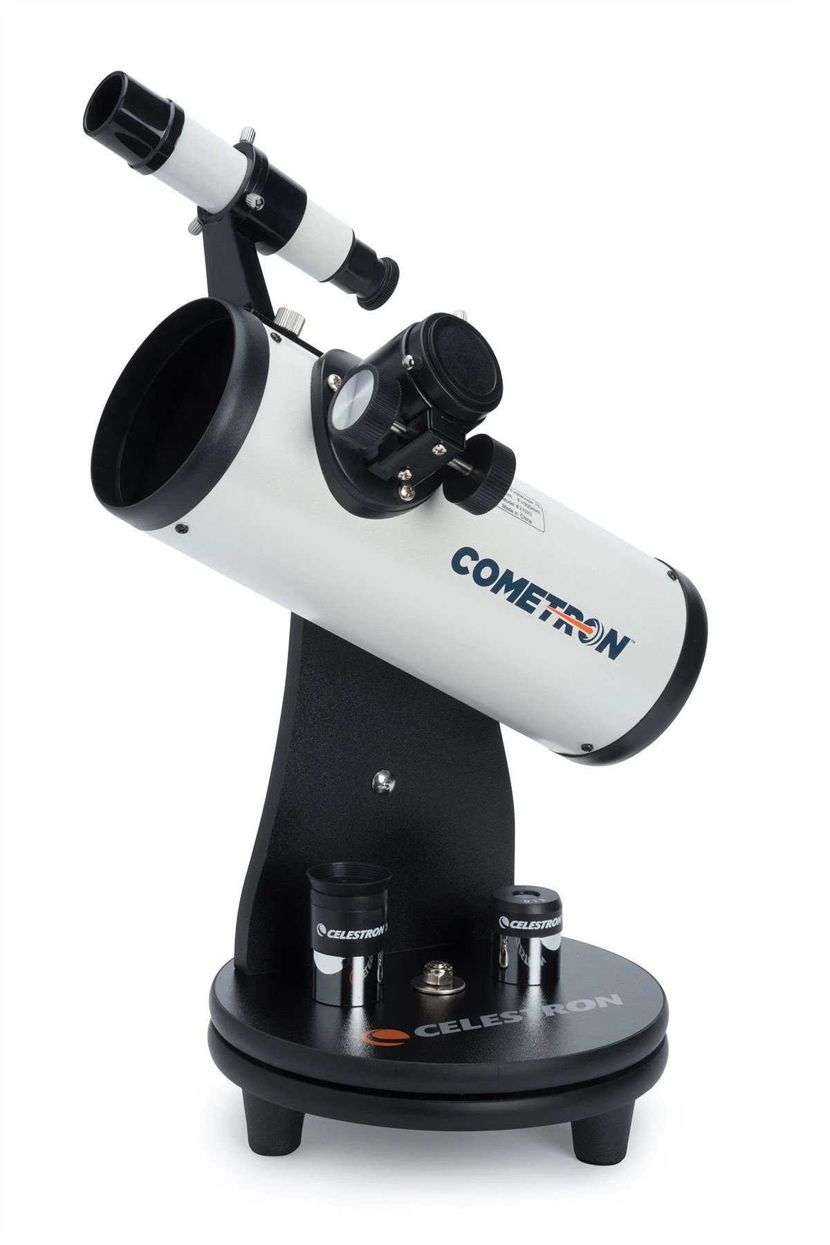 Be ready for the next big comet with Celestron’s special-edition Cometron FirstScope, a compact, lightweight telescope that’s perfect for beginners looking to experience the magic of a dazzling comet, planet, or nebula. This tabletop Dobsonian-style telescope includes a spherical mirror with a generous 76 mm of aperture. The Cometron FirstScope provides bright, sharp views of comets and other celestial objects, and renders the Moon’s mountains and craters in crisp detail. And thanks to its wide field of view, you’ll be able to observe the brightest part of the comet and its tail or favorite deep-sky objects like the Orion Nebula.