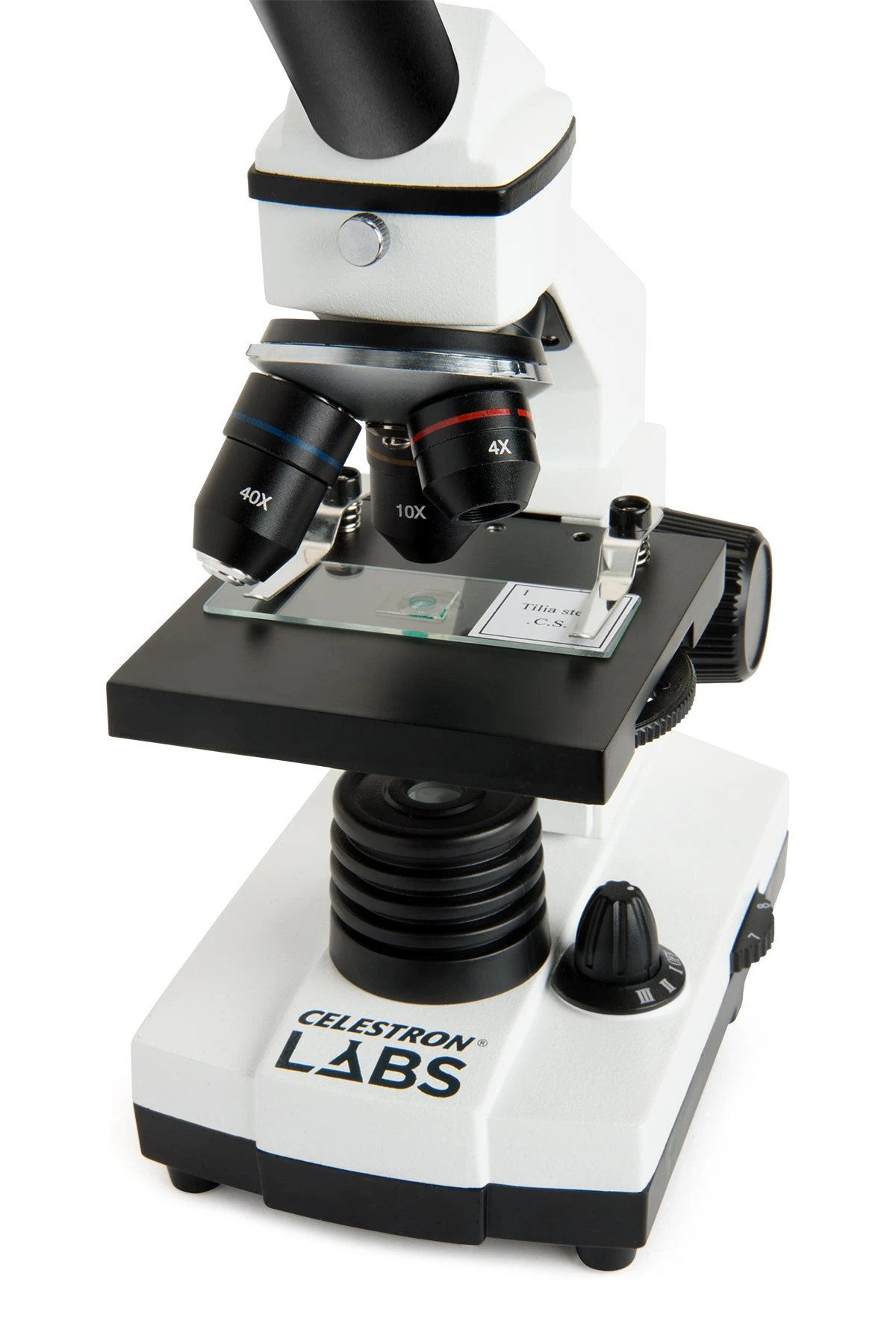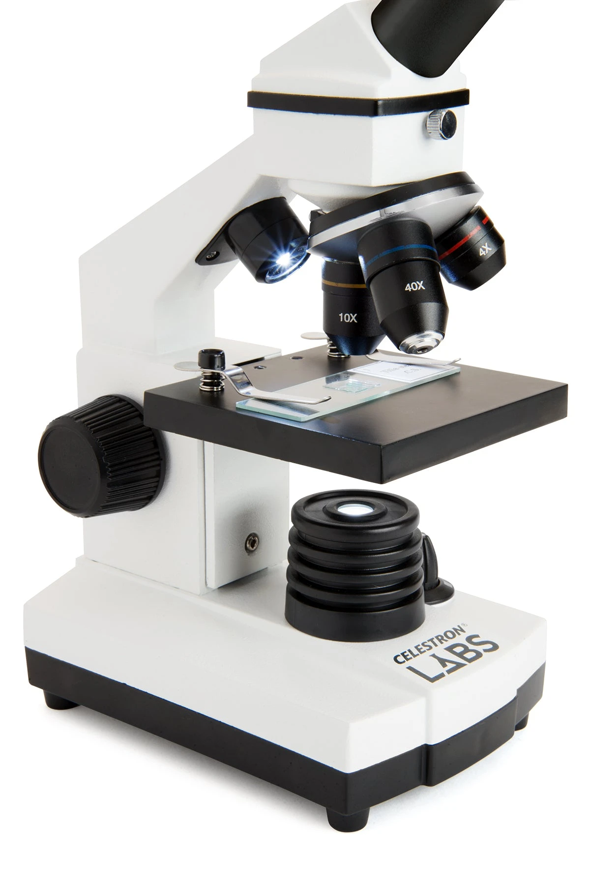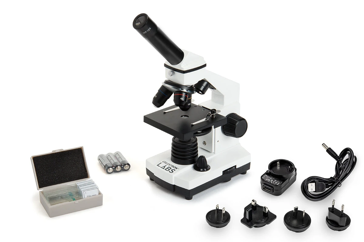 The Celestron Labs CM400 compound microscope offers all the essential features you need in a lab-ready microscope at an economical price. The 10x eyepiece and three objective lenses (4x, 10x and 40x) allow for magnifications of 40x, 100x, and 400x.