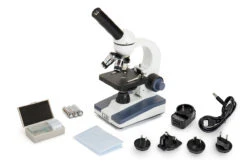 The Celestron Labs CM400C compound microscope offers all the essential features you need in a lab-ready microscope at an economical price. The 10x eyepiece and three objective lenses (4x, 10x and 40x) allow for magnifications of 40x, 100x, and 400x.