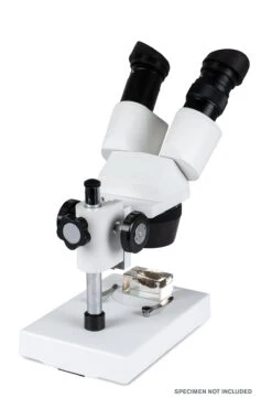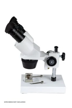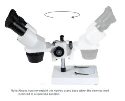 To accommodate large samples, you may need to expand your focus range by vertically sliding the head along the pillar stand to bring the image into sharp focus. For specimens that do not fit on the microscope base, like fossil bones, the Celestron Labs S10-30N microscope head can rotate around the pillar stand.