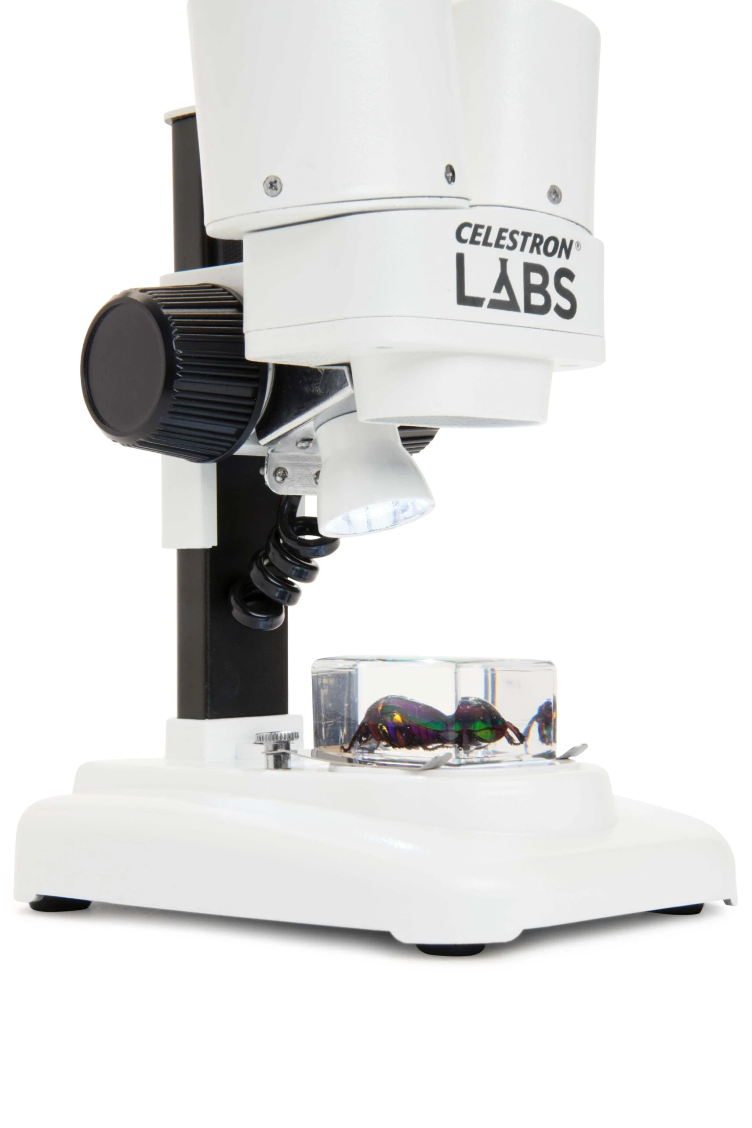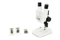The Celestron Labs S20 is the perfect introductory stereo microscope offered at an economical price. With its 20x power, it’s well suited for viewing details on 3D objects such as leaves, insects and many other objects. The upper LED illuminator provides detailed viewing and with the removable stage plate there is an option for bottom lighting (user supplied). You’ll enjoy exciting discoveries right out of the box with the two included insect specimens. The S20 Stereo Microscope is light and easy to carry in the field making it well suited for hobbyists and students.