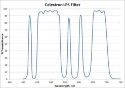 The Light Pollution Imaging (LPI) Filter for the 8” RASA blocks light from some of the most common sources of light pollution between 400-700nm (i.e., the visible spectrum), including high- and low-pressure sodium-vapor streetlights, mercury-vapor streetlights, and natural airglow caused by oxygen in the atmosphere. Unlike some light pollution filters, the LPI filter blocks only specific areas of the spectrum instead of wide regions. This helps to maintain image brightness and color balance. In addition, specific wavelengths associated with emission nebulae, such as H-α(656nm), H-β (486nm), OIII (496nm and 501nm), and SII (672nm), are highly transmitted, ensuring minimal loss of image brightness for those objects.