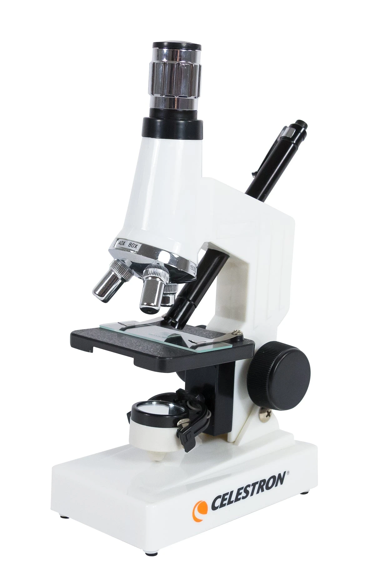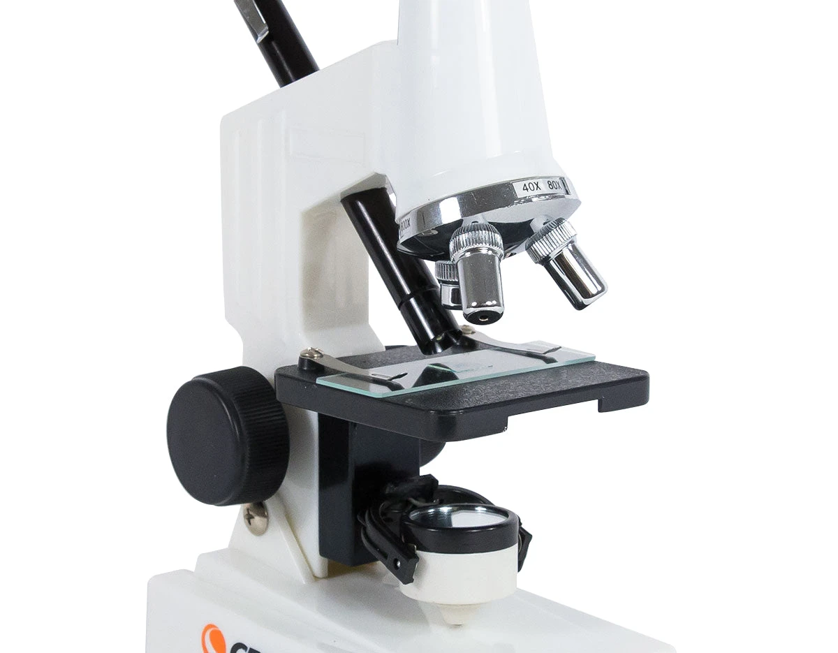 The entry-level Celestron Microscope Kit with magnification from 40x to 600x is the perfect tool for the budding scientist. At high power, it’s ideally suited for examining specimen slides of yeasts and molds, cultures, plant and animal parts, fibers, bacteria, and more. Use the lower magnifications to examine objects like coins, rocks, insects, and more. Start out by using the provided specimen slides, and then create some of your own!