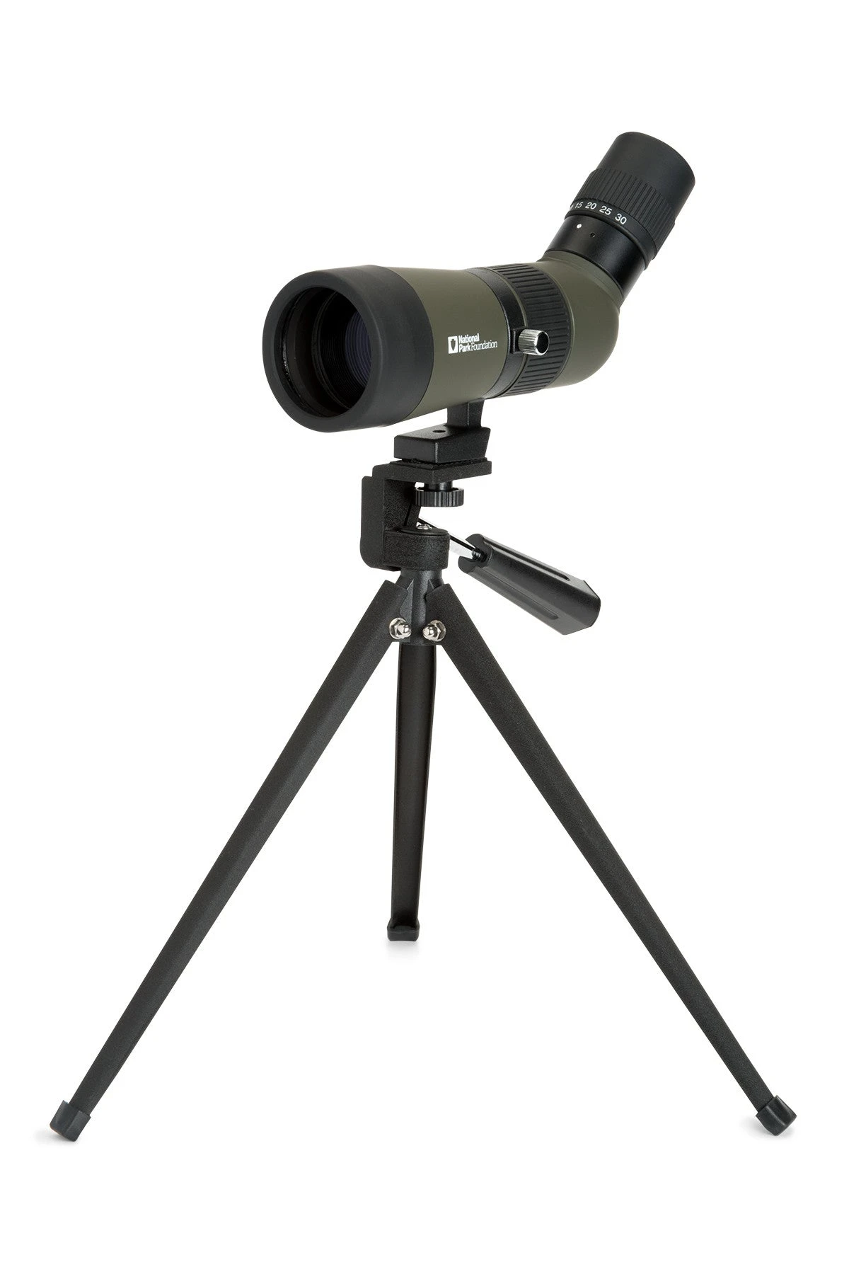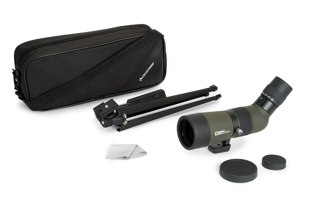 The spotting scopeâs compact, lightweight design is ideal for carrying with you on a backpacking trip or hiking excursion. Youâll be able to set up this spotting scope and begin observing in no time! With the 10-30x zoom, youâll be able to quickly spot your subject at 10x magnification and then achieve up-close, detailed views of up to 30x. The rotating tripod mount rotates a full 360 degrees allowing you to set the eyepiece in the perfect position. The National Park Foundation 50 mm Spotting Scope features fully-coated optics and provides bright, sharp views.