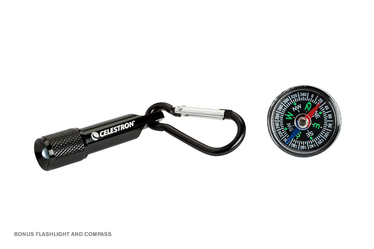 The Travel Scope 60 comes with two eyepieces (20mm and 8mm), a 45° erect image diagonal, a 3x Barlow lens, a 5×24 finderscope, a Moon filter, a compass, and a travel backpack. The two eyepieces offer different magnifications to view your intended object. The erect image diagonal allows for right-side-up viewing ideal for terrestrial subjects but can also be used for celestial objects. The 5×24 finderscope will help you quickly center an object in your eyepiece for easier observing. Connect the 3x Barlow lens to your eyepieces to boost your magnification by a factor of three. Paired with the included eyepieces, the Barlow delivers 54x and 135x magnification for up-close views.