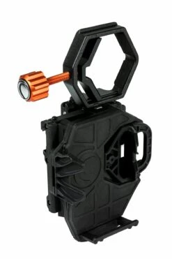The NexGO sports rack and pinion X- and Y- fine adjustment knobs for precise alignment and it folds up to a smaller size for easy transport. Secure the NexGO smartphone adapter to your eyepiece by tightening the orange knob which will clamp the unit around the eyepiece.