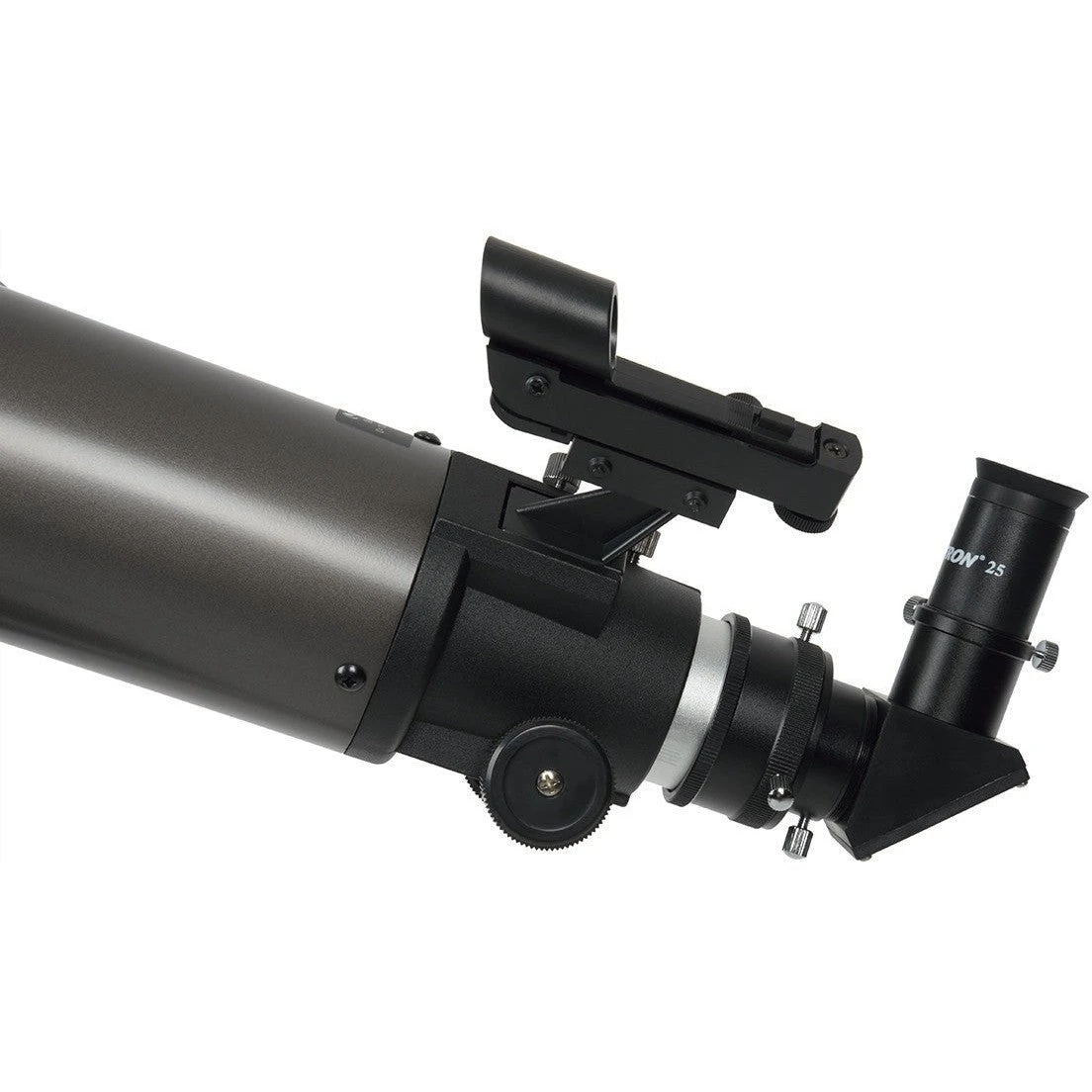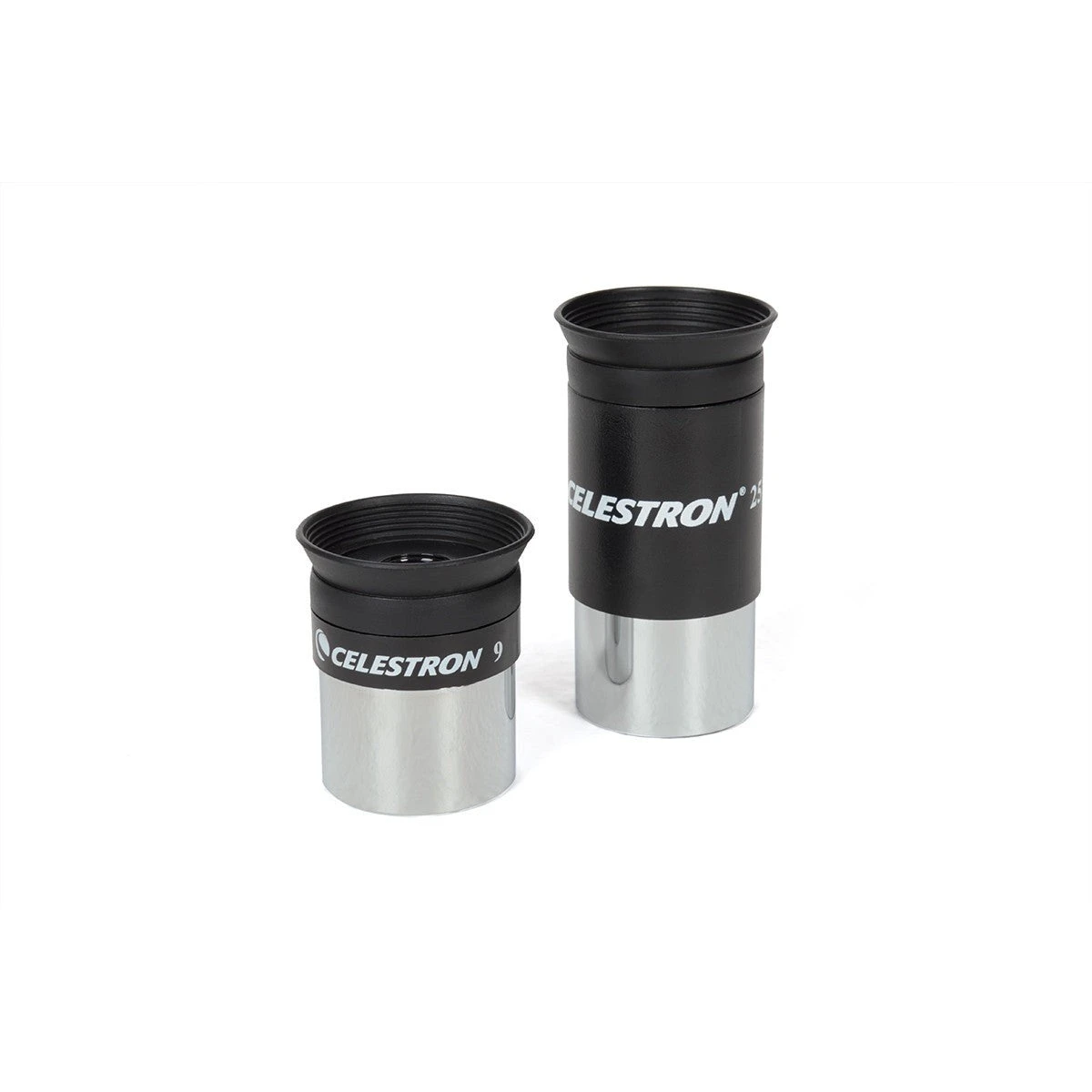 Your telescope includes a StarPointer™ red dot finderscope, a star diagonal, and two eyepieces (25mm and 9mm). The two eyepieces offer different magnifications for low- or high-powered observing. The star diagonal provides a right-side-up view and a more comfortable viewing angle when looking up at the sky. The StarPointer™ red dot finderscope will help you quickly center an object in your eyepiece for easier observing.