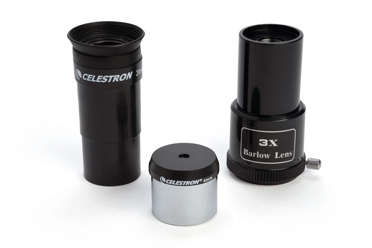 Accessories include a 20mm and 4mm eyepiece, a finderscope, and a 3x Barlow lens. The two eyepieces offer different magnifications for low and high-powered views. The 3x Barlow lens triples the magnifying power of each eyepiece.