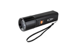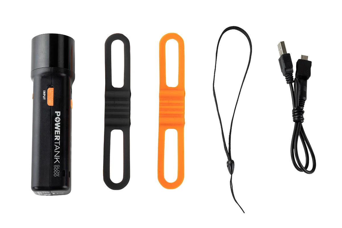 The flashlight can be used while the output port is charging an external device. Four red battery indicator LEDs indicate the battery charge status, while a green LED indicates when the PowerTank Glow 5000 is providing power to a device.