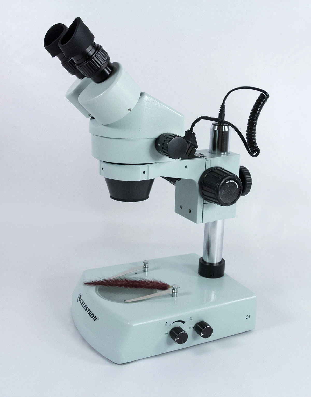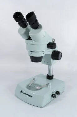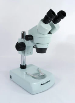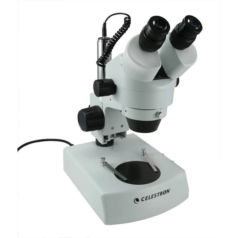 The Celestron Professional Stereo Microscope is a large, all metal bodied, low power stereo microscope with advanced features like fully coated glass optics, 0.7x to 4.5x zoom objectives, 10x and 15x wide field eyepieces and upper and lower illuminators.