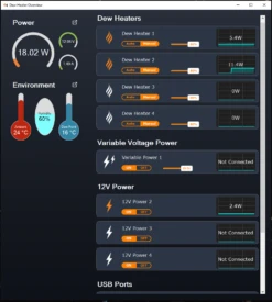 The Smart DewHeater and Controller comes with four ports to control four dew heaters at once. You can use one port to heat your optical tube while the others warm a second optical tube, a guide scope, an eyepiece, or another accessory. The controller is also a complete power management solution for your telescope. It offers four 12V DC output ports to power a variety of 12V DC devices, such as your mount, focus motor, and camera. One of the ports has variable voltage, which you can adjust from 3V to 12V. In addition, the controller features three powered USB ports.