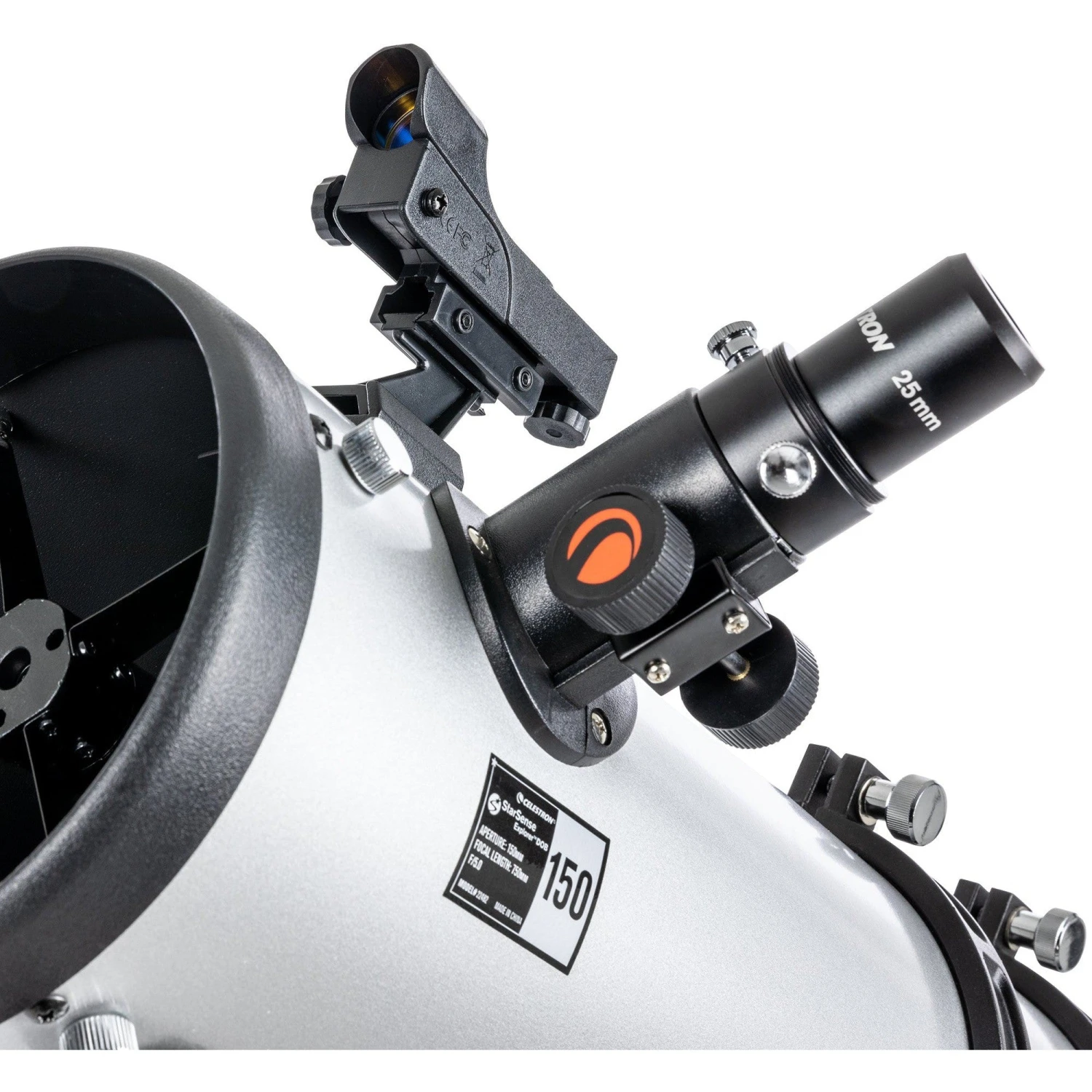 This telescope features a 1.25” rack-and-pinion focuser that accepts 1.25” eyepieces and dust covers for the front of the tube and the focuser.