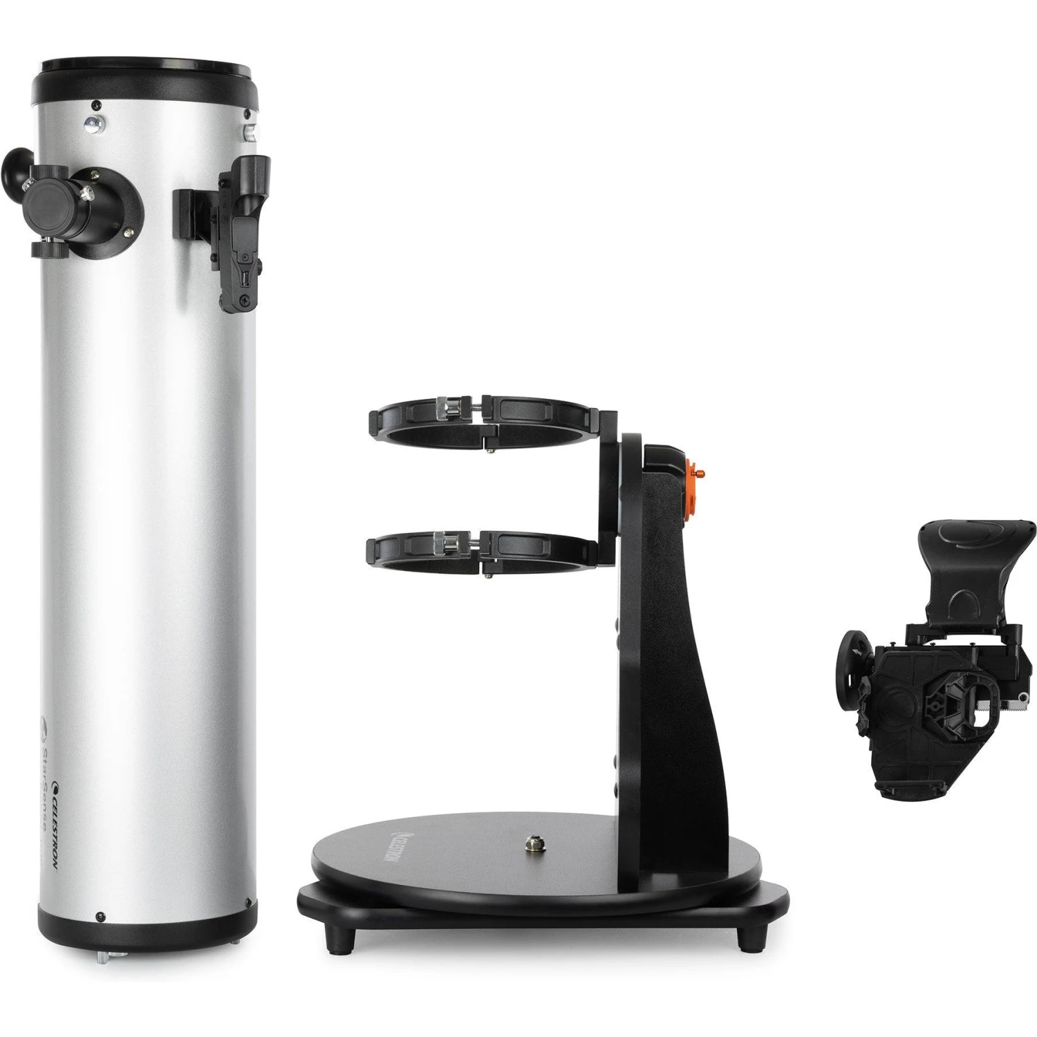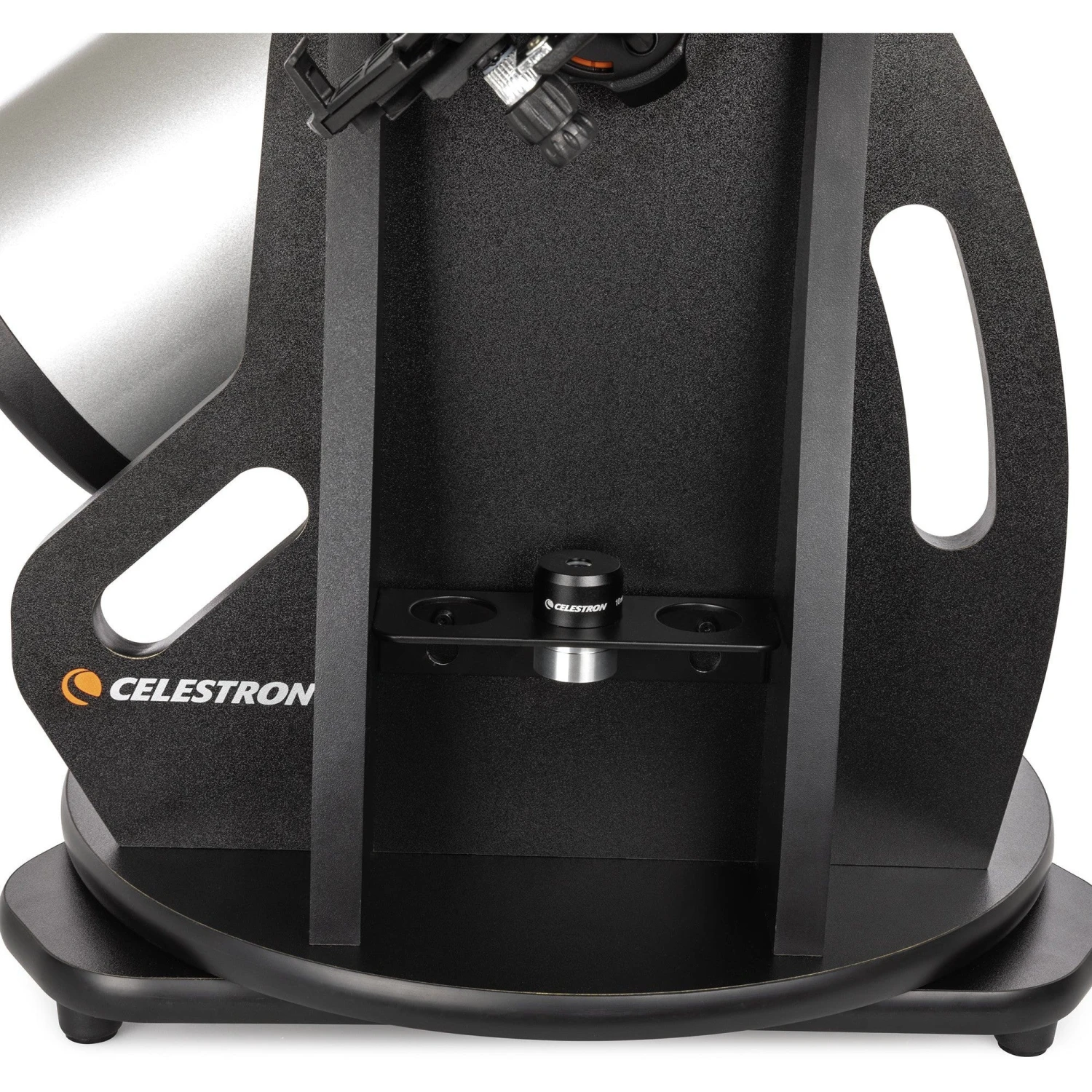 The optical tube connects to the base via tube rings. It’s easy to adjust the tube’s position in the rings so the focuser is in the best viewing position. The base features an eyepiece rack to keep your extra eyepiece(s) close at hand.
