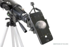 Smartphone Adapter – Image celestial or terrestrial objects with this smartphone adapter. With its light, rigid frame, this accessory allows you to connect any smartphone to any telescope eyepiece with an outside diameter of 45mm or smaller. The additional magnification provided by the eyepiece allows your phone to capture great images of the Moon and planets. This smartphone adapter installs easily by clamping over the top of an eyepiece. The smartphone is held in position with the help of tightening knobs that securely lock your phone in place. Some large and/or bulky phone cases (including folio style cases) may need to be removed for the phone to fit in the adapter.