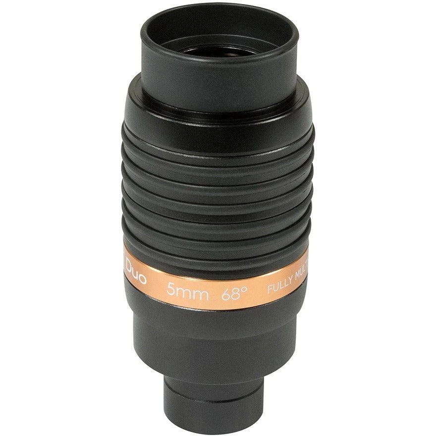 Enjoy impressive views with a wide 68-degree apparent field of view. Celestronâs fully multi-coated optics increase light transmission and contrast, while blackened lens edges prevent internal reflections. The result is bright, pinpoint stars on a black field. A generous 20mm of eye relief and fold-down rubber eyeguard make Ultima Duo comfortable to use without removing eyeglasses.